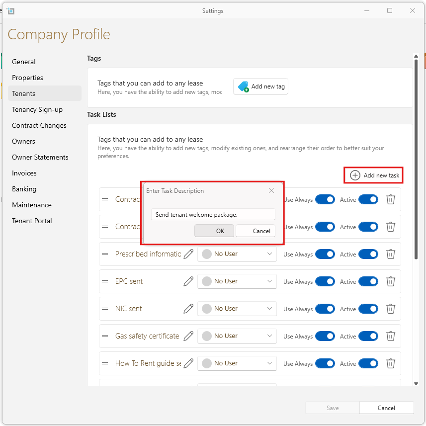 • You can always, add or remove specific tasks for individual tenancies, manually.