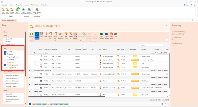 Effortlessly filter and organize your leases with the tag-based filtering option in the lease management window.